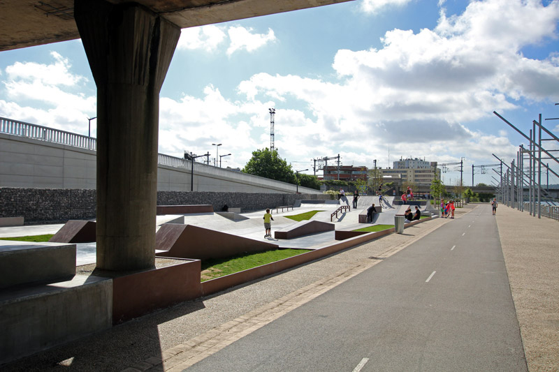 This long skatepark sites between a river, a busy bike lane and arterial motorway, transforming dead space into an attractive amenity. It also gives some good pointers on how to handle local car and bike traffic